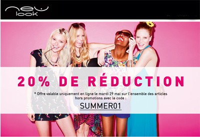 New Look se devait de célébrer dignement le retour des beaux jours en organisant une journée spéciale sur son site Internet. Aujourd’hui et aujourd’hui seulement, vous pouvez bénéficier de 20% de réduction sur tous les vêtements, chaussures et accessoires (hors promotions).