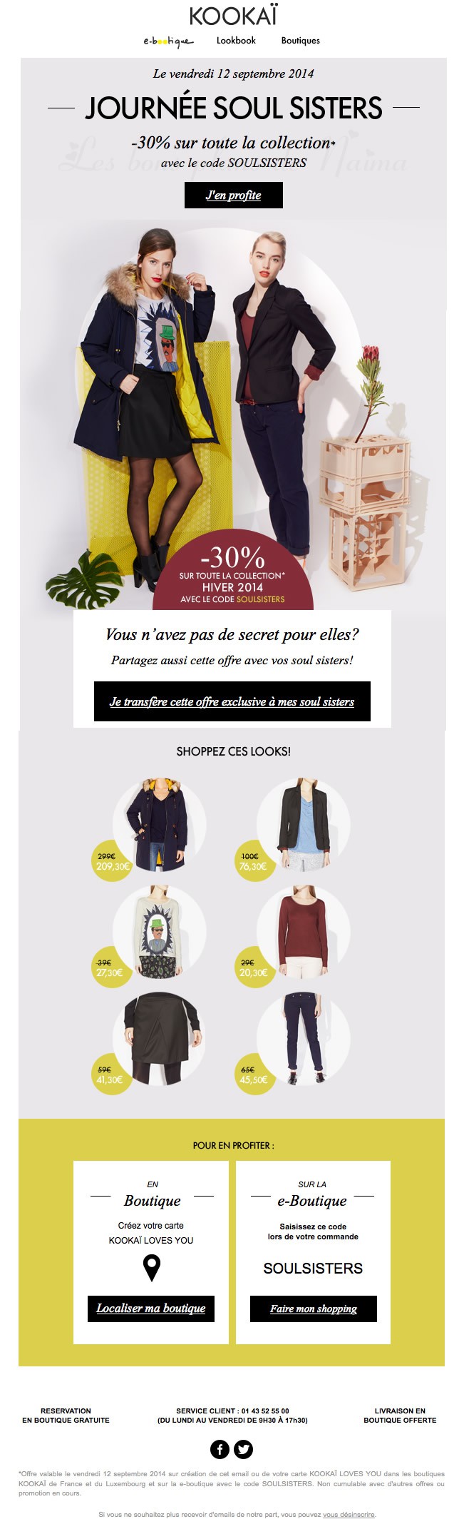 Sur www.kookai.fr : le code promo à indiquer est SOULSISTERS. La livraison en magasin est gratuite sans minimum d’achat 😉