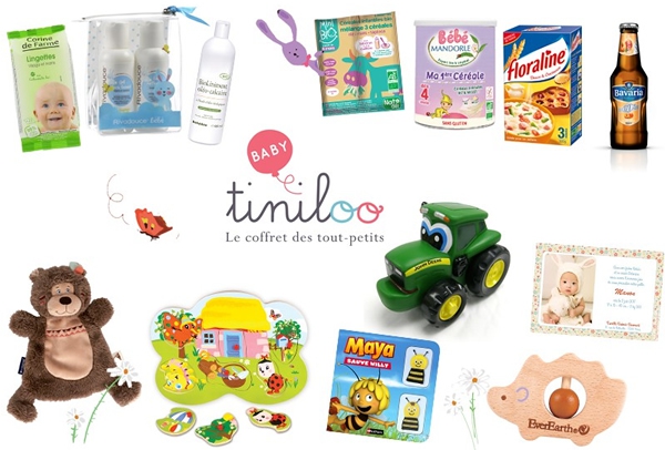 La box Tiniloo 0 à 36 mois : Le contenu de la box est adaptée à l’âge et au sexe du bébé et contient entre 4 et 6 produits (jouets, livres, produits de soin, articles de puériculture, vêtements, gourmandises…).