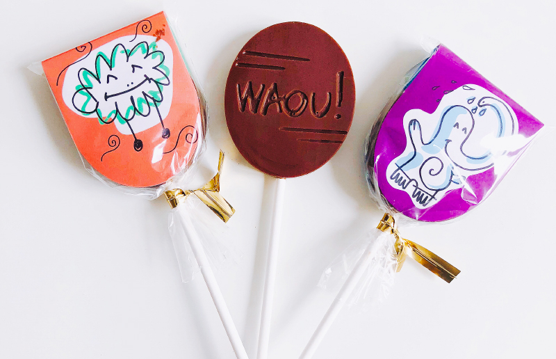 Pour les enfants, Michel Cluizel proposent de nouvelles sucettes chocolatées sans colorant : les Gribouilles de choc ! Du chocolat au lait fourré avec un praliné à l’ancienne. Elles sont vendues 2,80€ l’unité.