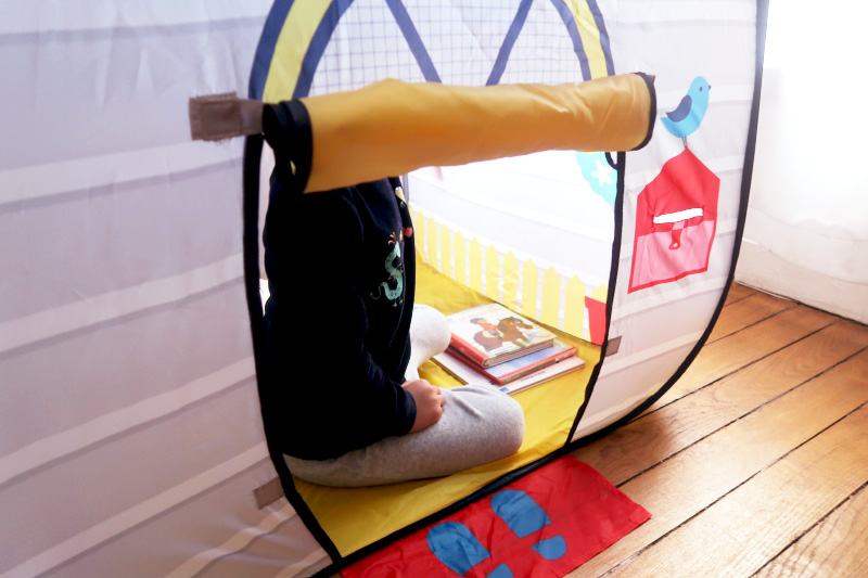 Mon garçon s’est très vite approprié son nouveau chez soi ! Il s’y amuse tout seul pendant pas mal de temps à chaque fois. C’est son coin lecture préféré et il aime bien aussi y emmener ses jouets (surtout ses petits animaux) ! Il n’arrête pas d’entrer et de sortir, de me faire des petits coucou depuis la fenêtre. L’autre soir, il a même pris une petite couverture pour se coucher à l’intérieur. C’est sa petite maison à lui, une sorte de résidence secondaire…