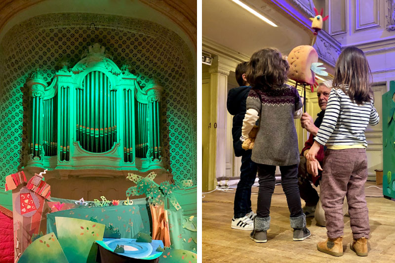 Sur scène : un décor champêtre qui monte et qui descend et des marionnettes biscornues accompagnées par des musiciens multi-instrumentistes ! L’histoire est un légèrement différente de l’originale mais plaît tout autant aux enfants !