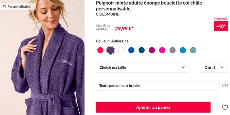 Si vous êtes à la recherche d’un cadeau cocooning original et pas cher, tous les peignoirs personnalisés de Blancheporte sont actuellement à -30 et -40% de réduction ! Le service de broderie est gratuit et la livraison est plutôt rapide (elle n’est pas plus longue que pour les autres produits du site) !