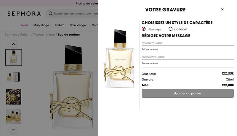 Ce service de gravure est possible sur 95 flacons de parfums pour femme et 43 pour homme. Il y a des marques comme Yves Saint Laurent, Lancôme, Kenzo, Armani… → www.sephora.fr/service-gravure